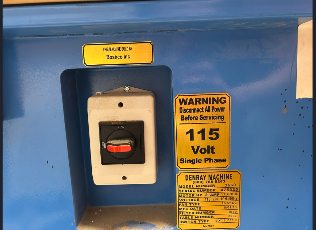 Used Denray Model 3660 down draft table, 36” x 60” flip up work area, 2hp 115volt motor, on/off control,